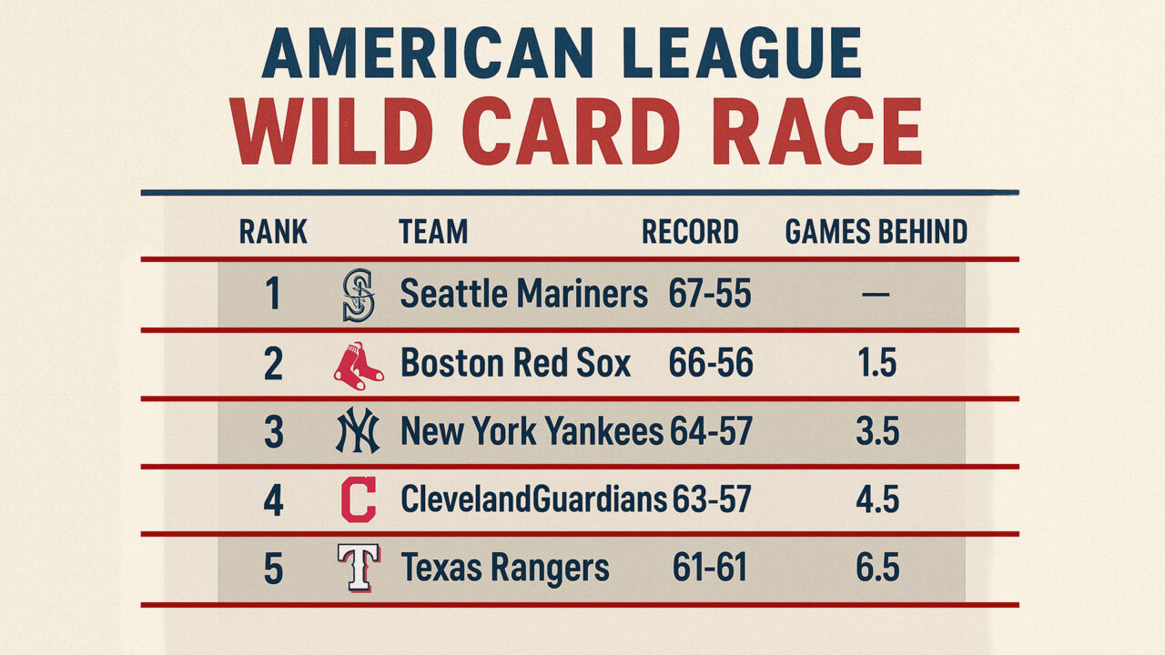 The Rangers sit in the 5th Wild Card spot at 61-61, trailing the Cleveland Guardians by 3.5 games (Guardians at 63-57). Wild card standings order: Mariners, Red Sox, Yankees, Guardians, and then the Rangers.